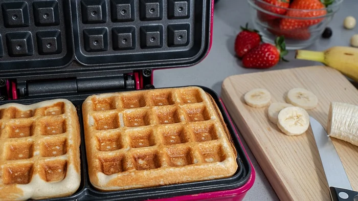 - Elektrinis vaflinis lygintuvas, įkaitinkite, sutepkite augaliniu aliejumi ir kepkite vaflius 3-4 minutes iki auksinės rudos spalvos.